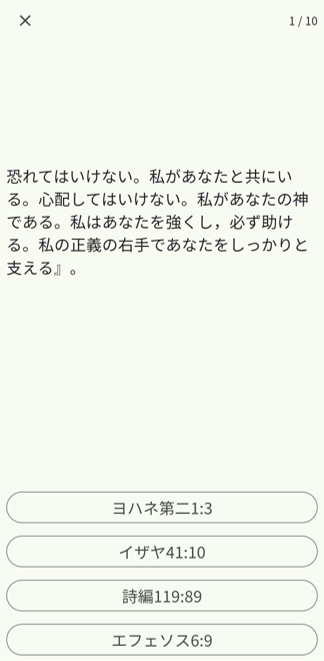 - 4択クイズ: 登録した聖句からランダムに出題される聖句の本章節を4つの選択肢から選ぶクイズに答えます。