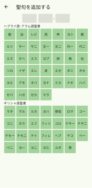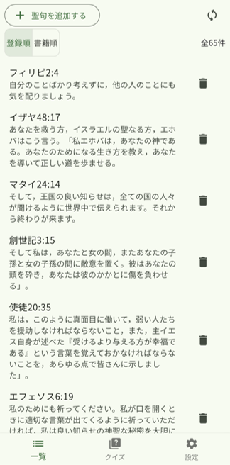 - 聖句の登録: 聖句の本、章、節と本文を登録します。 登録した聖句を削除することもできます。