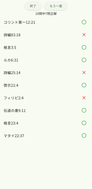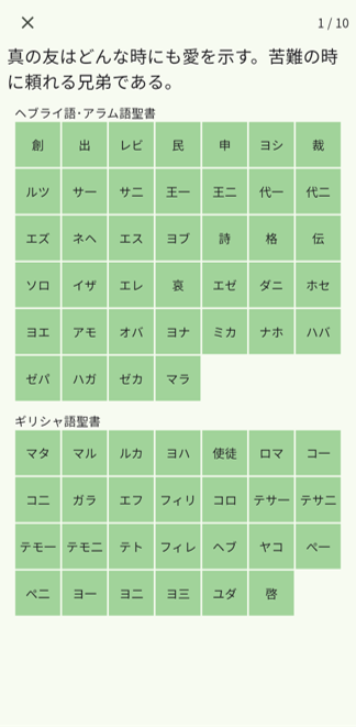 - 本章節クイズ: 登録した聖句からランダムに出題される聖句の本章節をすべて当てるクイズです。4択クイズよりも難易度が高いです。